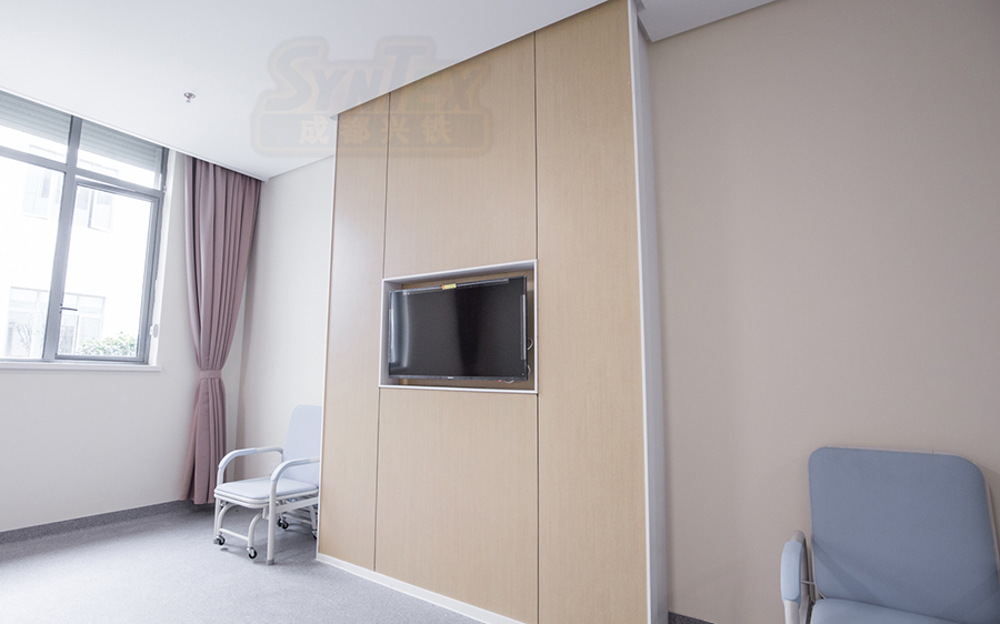 病房?jī)?nèi)床頭板采用木紋表面的鋼制墻板,溫馨,又不失醫(yī)護(hù)功能。